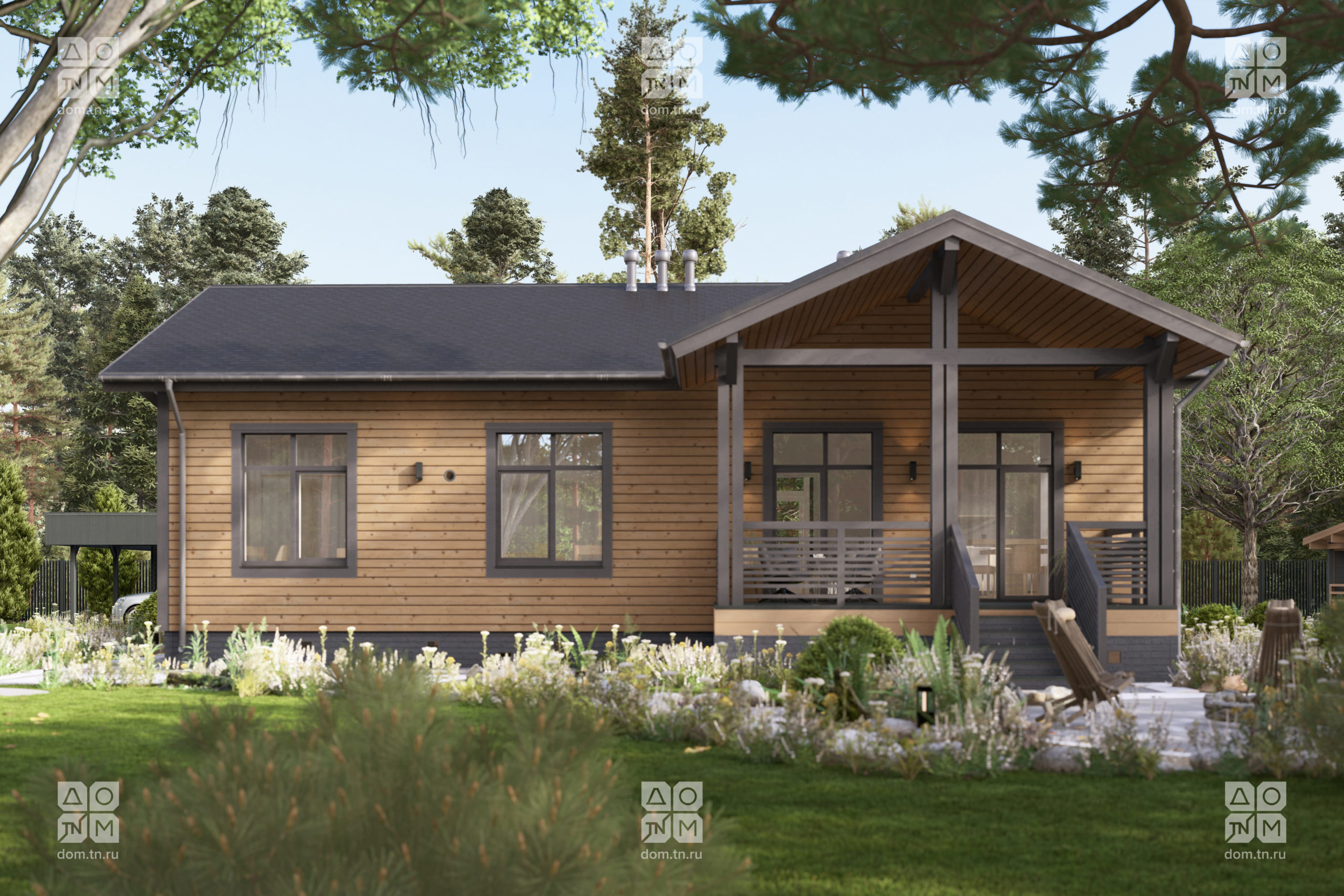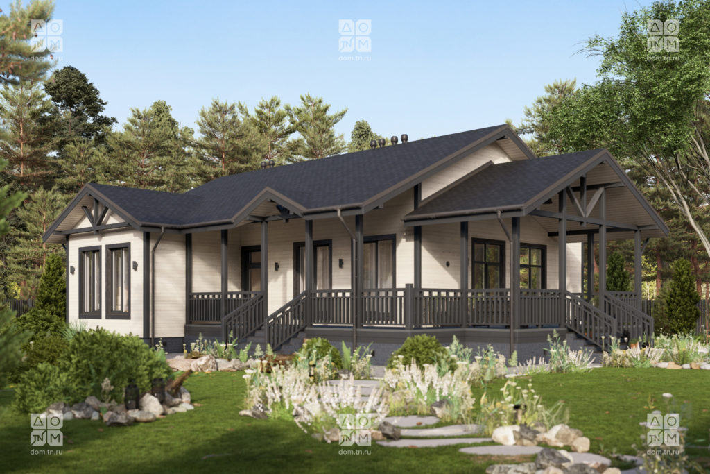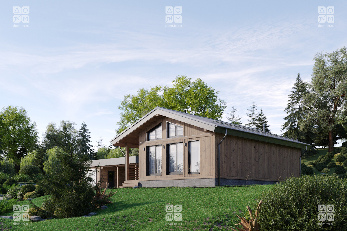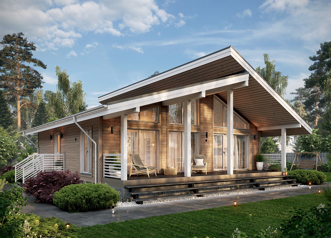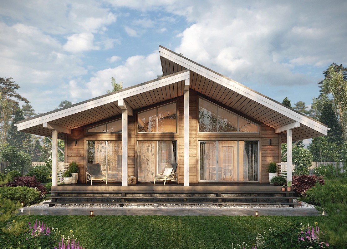 и объемом. Кухонная зона подходит для острова, рабочая поверхность размещается у окна.Терраса с навесом открыта с трёх сторон и расширяет пространство. Здесь удобно обедать, отдыхать, проводить время с семьёй и наслаждаться природой.
