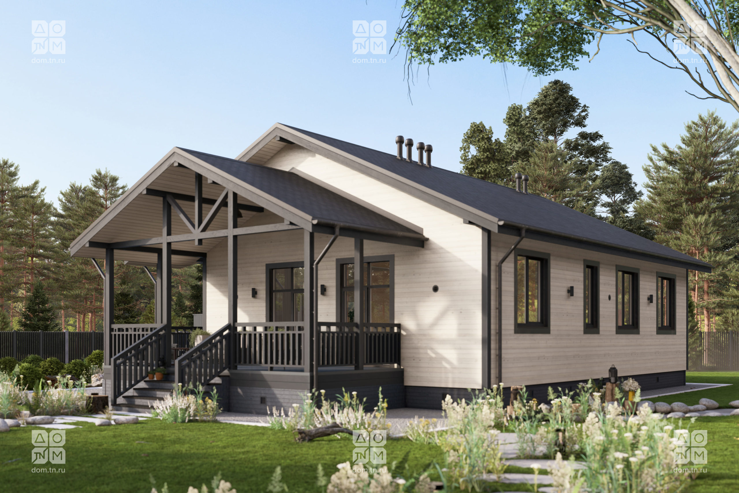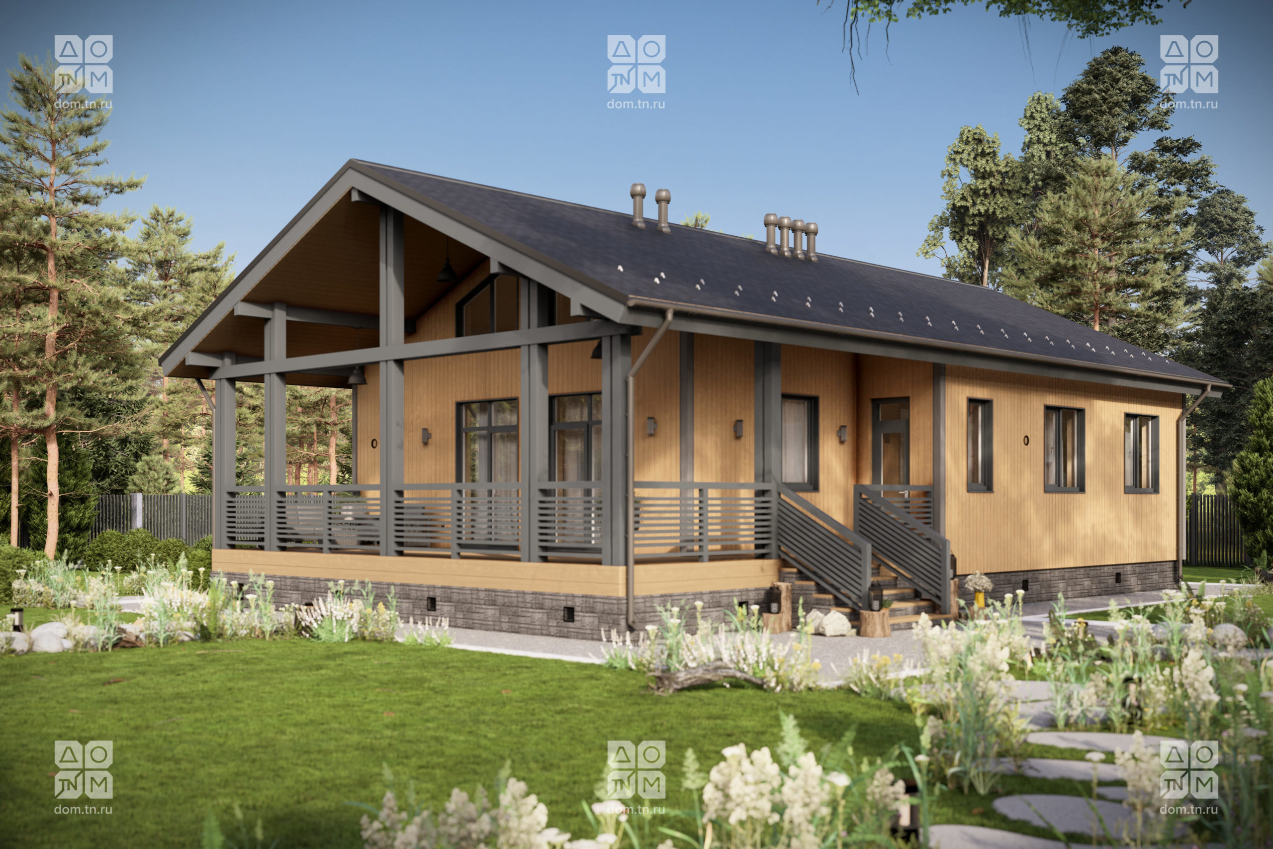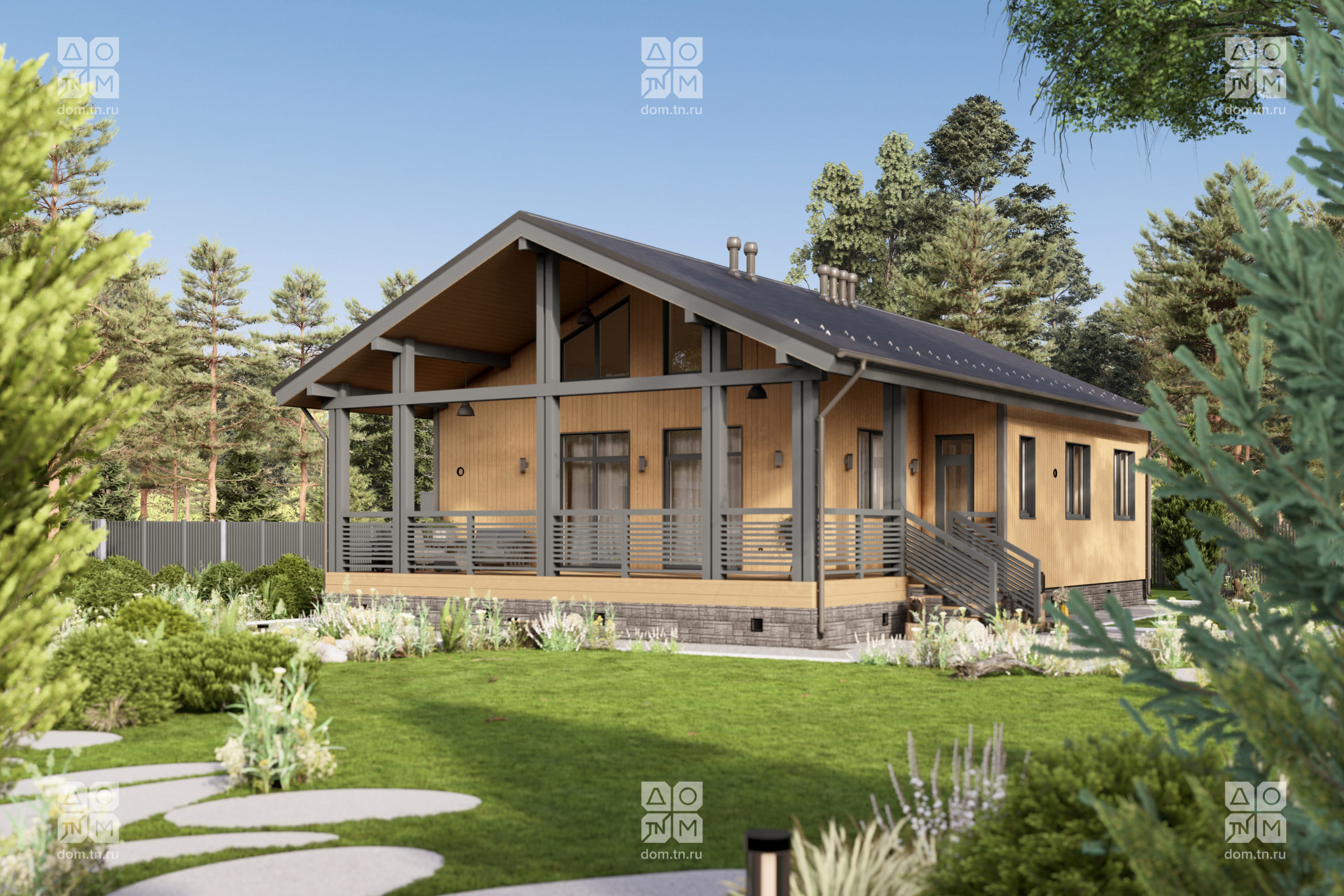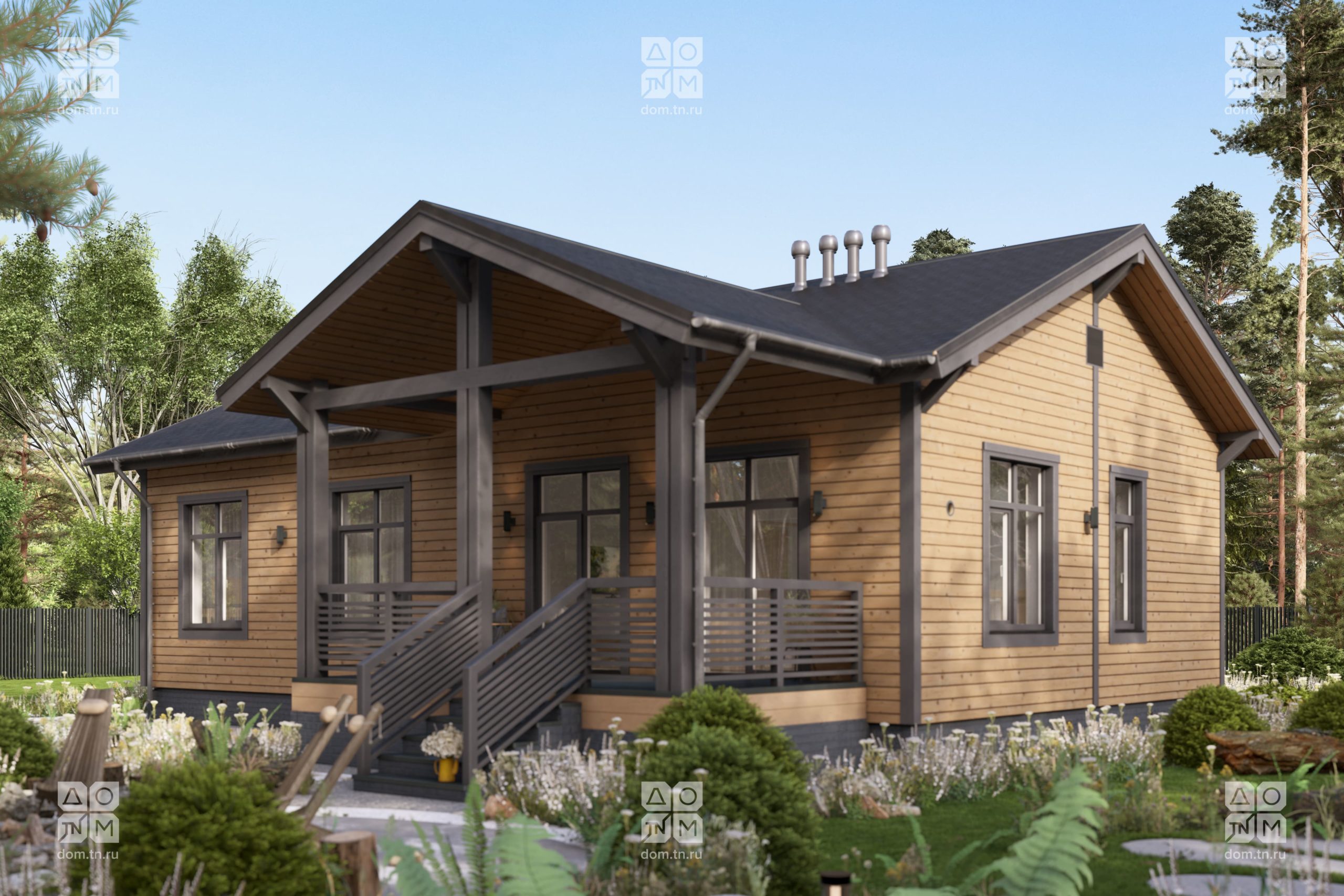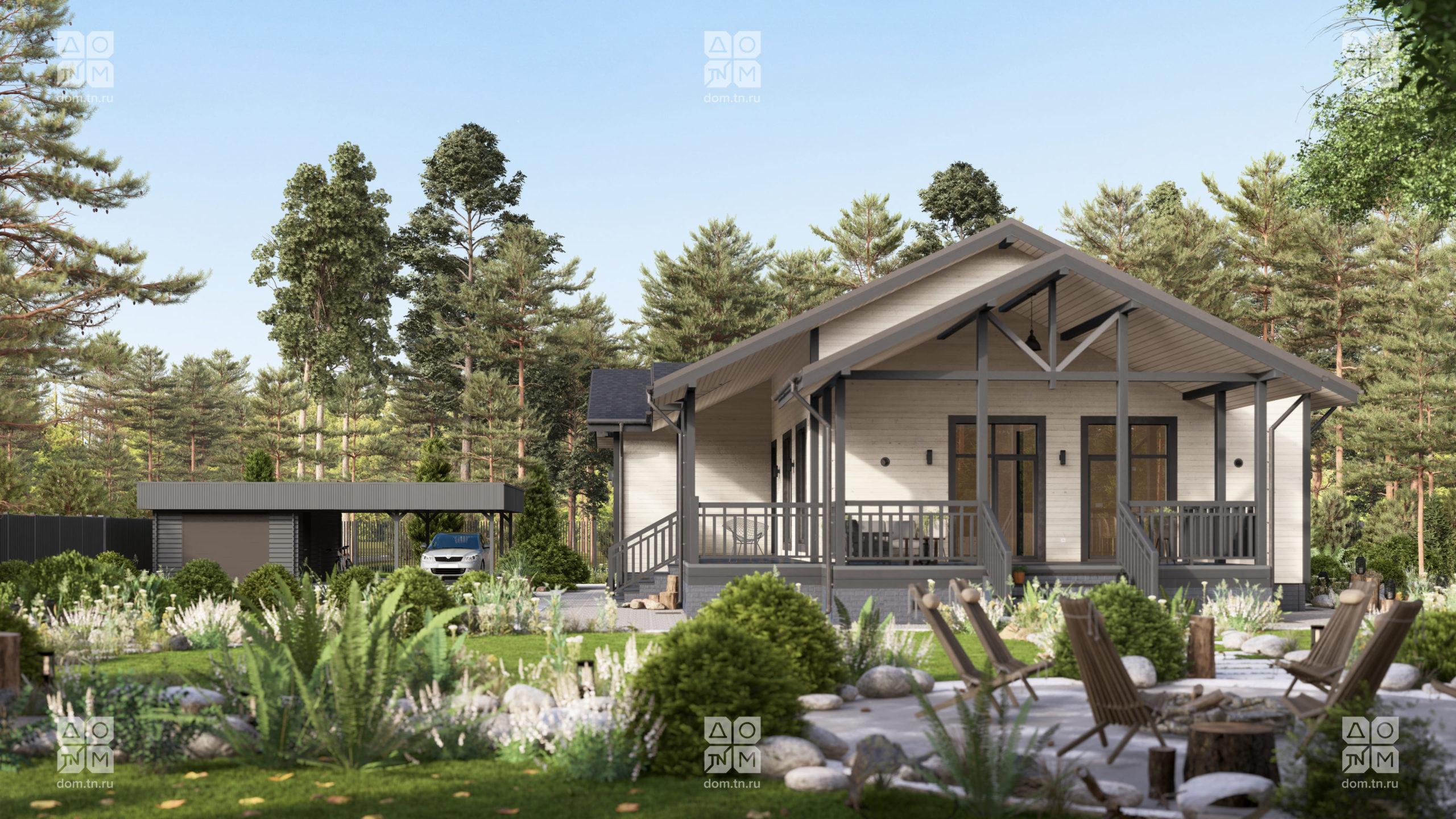 и объемом. Кухонная зона подходит для острова, рабочая поверхность размещается у окна.Терраса с навесом открыта с трёх сторон и расширяет пространство. Здесь удобно обедать, отдыхать, проводить время с семьёй и наслаждаться природой.