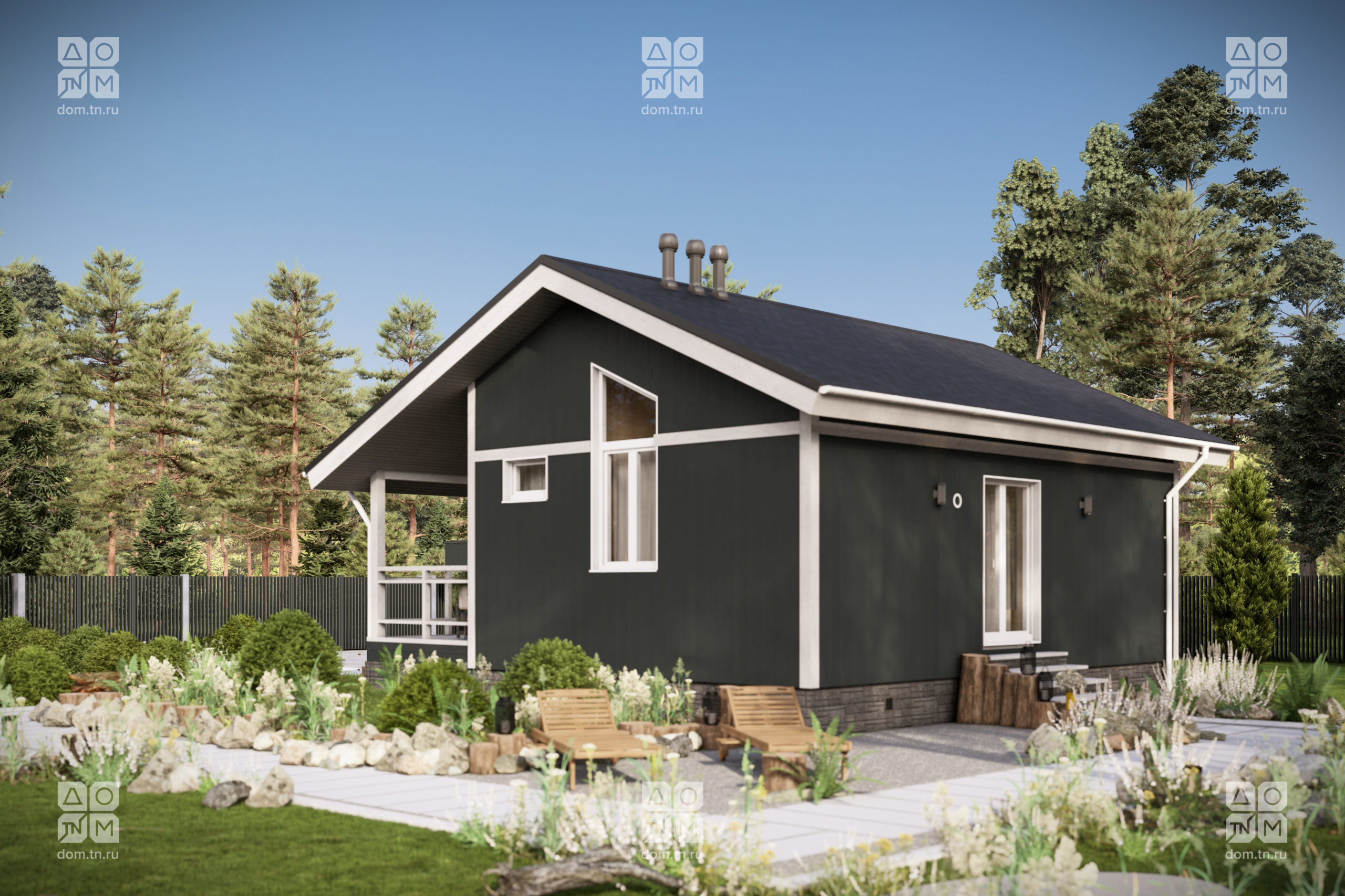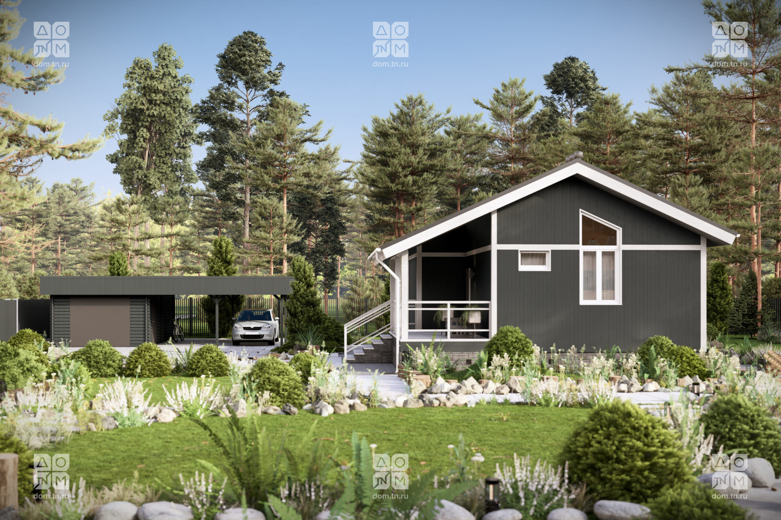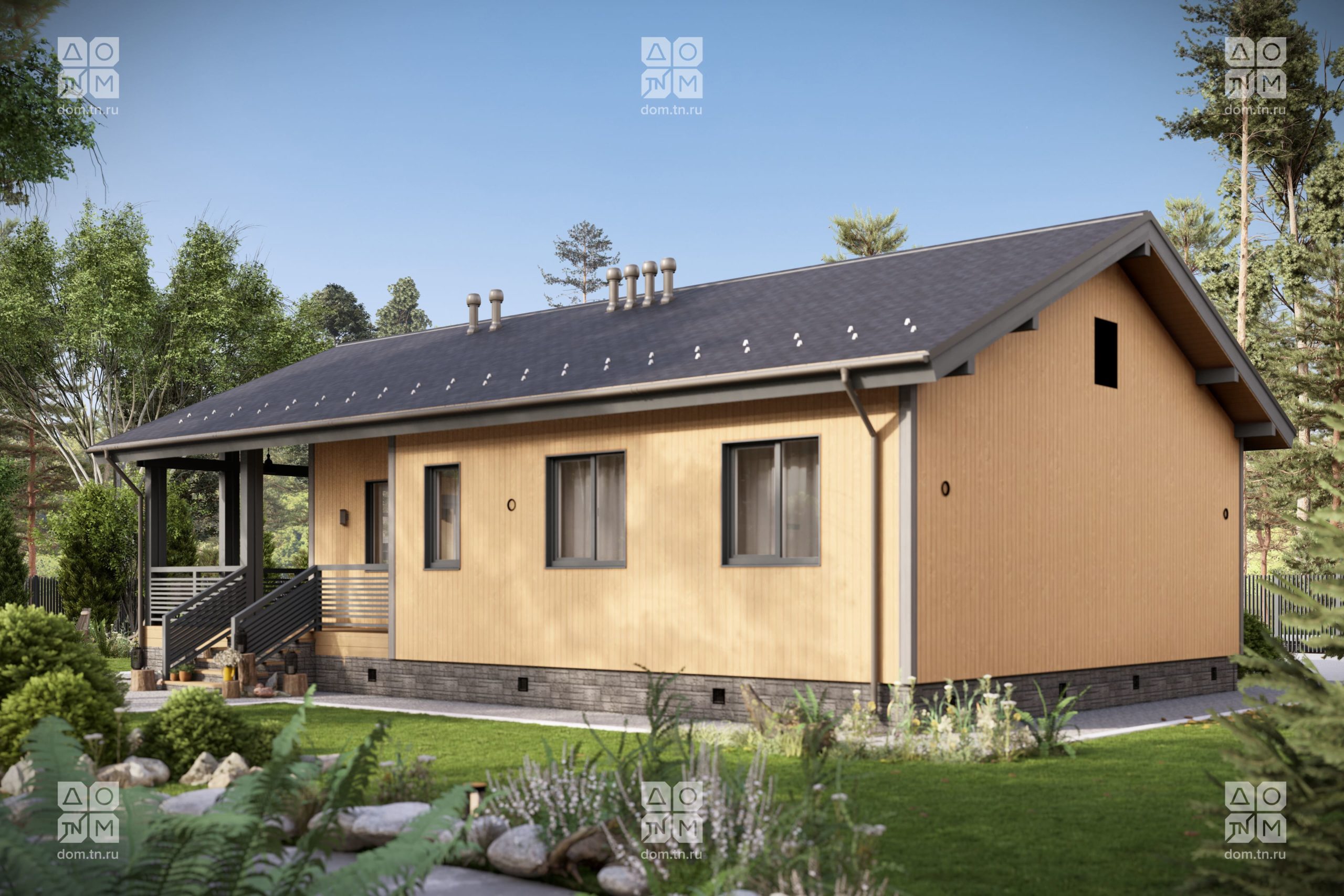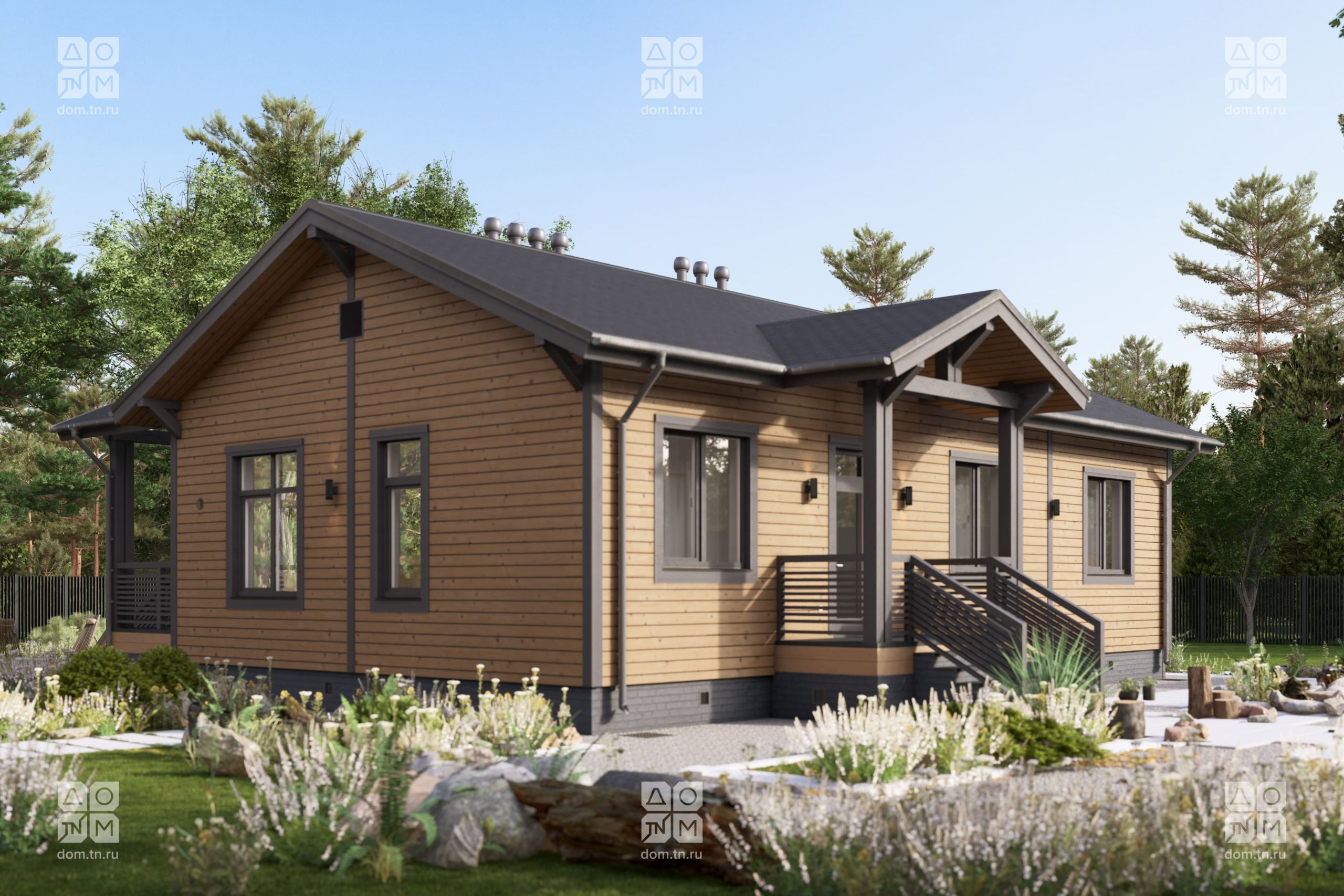 и объемом. Кухонная зона подходит для острова, рабочая поверхность размещается у окна.Терраса с навесом открыта с трёх сторон и расширяет пространство. Здесь удобно обедать, отдыхать, проводить время с семьёй и наслаждаться природой.