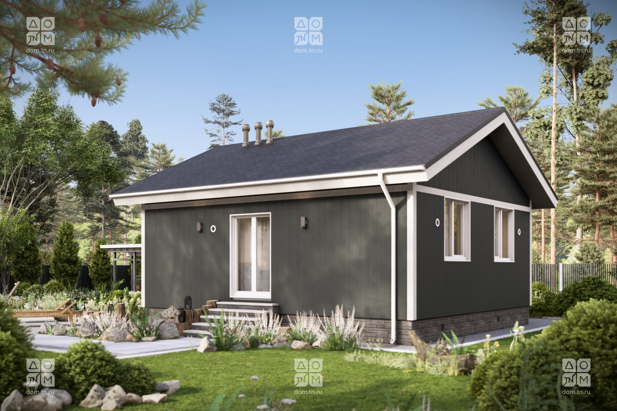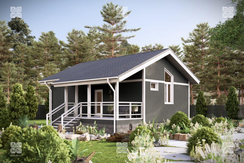 Каркасный дом общей площадью 60 м². Планировка включает две спальни, совмещенную кухню-гостиную и террасу. Дом оснащен двумя входами: основной