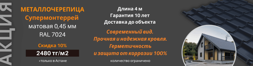 Только в Астане! Акция на матовую металлочерепицу супермонтеррей 0,45 мм — всего 2 480 ₸ за лист вместо 2 875 ₸.